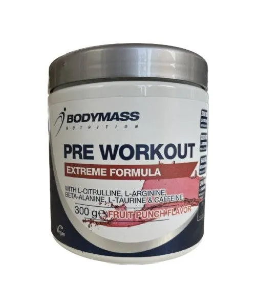 Le pré-workout BodyMass est un complément alimentaire conçu pour stimuler l’énergie et favoriser la prise de masse musculaire avant un entraînement. Il est disponible en poudre de 300 grammes au goût de fruit punch.
